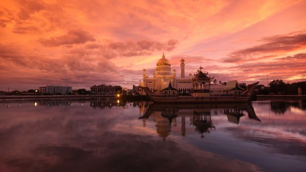 ブルネイのシンボルとなっているモスクで、1958年 第28代国王が在位中に建てたもので、世界中から集められた一流品の建材やインテリアが使用されています。黄金に輝くメインドームと4本の美しいミナレットが特徴的で、夜になるとライトアップされ、昼とはまた異なる幻想的な雰囲気です。