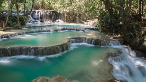 ルアンパバーン郊外に位置する美しい段々滝で、石灰岩台地を流れ落ちる水が作り出すエメラルドブルーの神秘的な青色が美しい。主瀑と大小数十の段々滝からなり、滝の周辺は熱帯雨林に囲まれたヒーリングスポット。