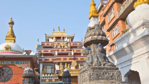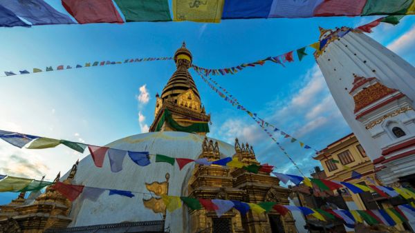 カトマンズ盆地西部の小高い丘の上に建つ仏教寺院で、2500年以上の歴史を持つネパール最古の仏教聖地の一つ。「モンキー・テンプル」の愛称で親しまれ、境内に多数の猿が生息している。中央の白いストゥーパ(仏塔)には仏陀の智慧の目が四方向に描かれ、カトマンズ盆地全体を見守っている。365段の石段を登って到達する山頂からは、カトマンズ市街とヒマラヤの山々を一望できる絶景ポイントとして人気。