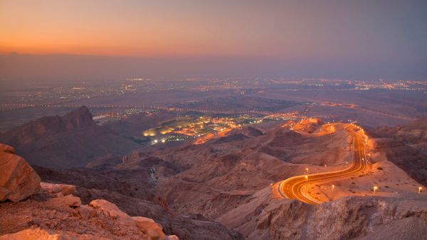 アル・アイン近郊にそびえるジェベル・ハフィート(標高約1,249m)は、UAE屈指の絶景ドライブルートとして知られています。山頂へと続く美しい山岳道路を進むにつれ、砂漠の大地が徐々に広がり、夕暮れ時には空と砂の色が溶け合うドラマチックな景色に。