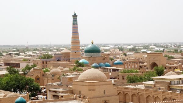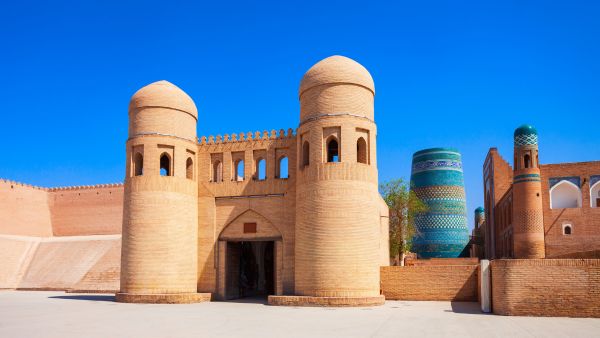 ウズベキスタン西部、カラクム砂漠のオアシスに位置する古都。16-19世紀にヒヴァ・ハン国の首都として栄えた城塞都市で、城壁に囲まれた旧市街「イチャン・カラ」は世界遺産に登録されている。まるで中世にタイムスリップしたような完全に保存された城郭都市で、砂漠の中に忽然と現れる青と土色の建物群は幻想的な美しさを放つ。シルクロードの隊商都市として重要な役割を果たした。