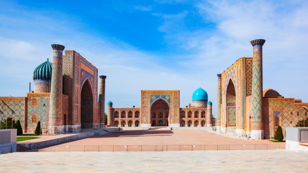 サマルカンドの中心部にある3つのメドレセ(イスラム神学校)に囲まれた壮麗な広場。15-17世紀に建設されたウルグ・ベク・メドレセ、シェルドル・メドレセ、ティラ・カリ・メドレセが三方を囲む構成で、中央アジア建築の最高傑作とされる。青いタイルで装飾された美しいドームと精緻な幾何学模様、アラビア文字の装飾は「青の都」サマルカンドの象徴として世界中から観賞される。
