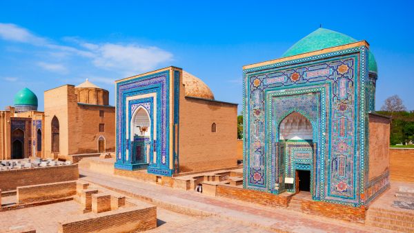 サマルカンド北部の丘陵地帯にある11-15世紀の霊廟群。預言者ムハンマドの従兄弟クサム・イブン・アッバースの墓を中心に、ティムール朝の王族や貴族の霊廟が建ち並ぶ聖地。「生ける王の墓」という意味の名前を持ち、青とターコイズブルーのタイル装飾が施された美しい霊廟群は、イスラム建築芸術の宝庫として巡礼者と観光客が絶えず訪れる。
