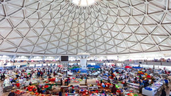 タシケントにある中央アジア最大級の伝統市場の一つ。円形のドーム型建物が特徴的で、新鮮な果物や野菜、香辛料、ドライフルーツ、伝統工芸品など、ウズベキスタンの豊かな物産が集まる活気あふれる市場。現地の人々の日常生活を垣間見ることができ、ウズベキスタンの食文化や商業文化を体験できる貴重な場所。